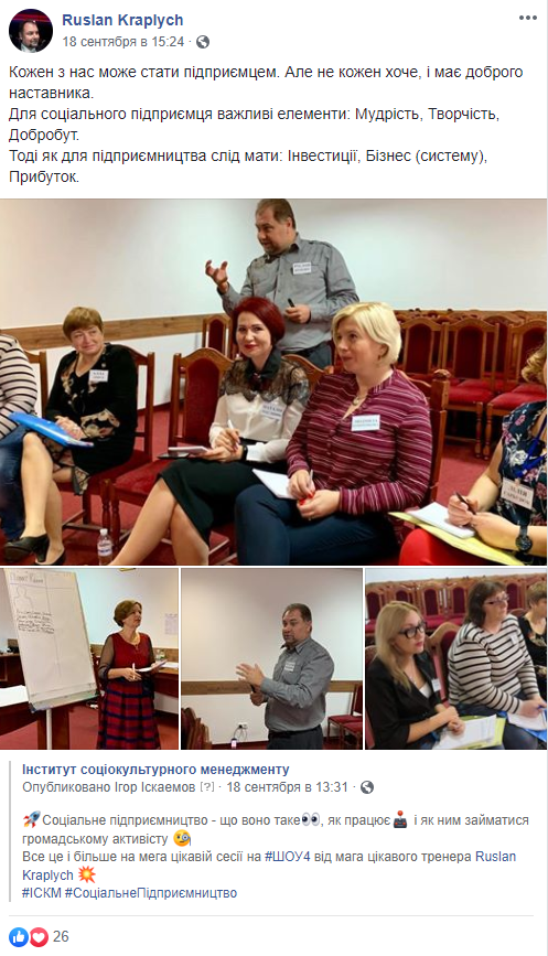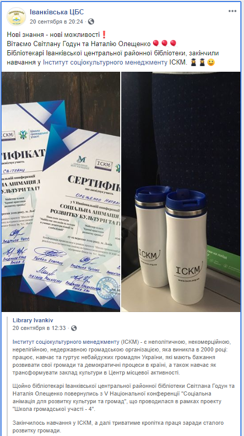 В рамках проекту «Школа громадської участі-4», з 17 по 19 вересня 2019 року проведено підсумковий захід – П’яту національну конференцію «Соціальна анімація для розвитку культури та громад». Проект «Школа громадської участі-4» (ШОУ-4) реалізується Інститутом соціокультурного менеджменту за фінансової підтримки Фонду ім. Ч.С. Мотта. Детальніше про захід можна прочитати у матеріалі – Вищий пілотаж соціальних аніматорів ШОУ-4